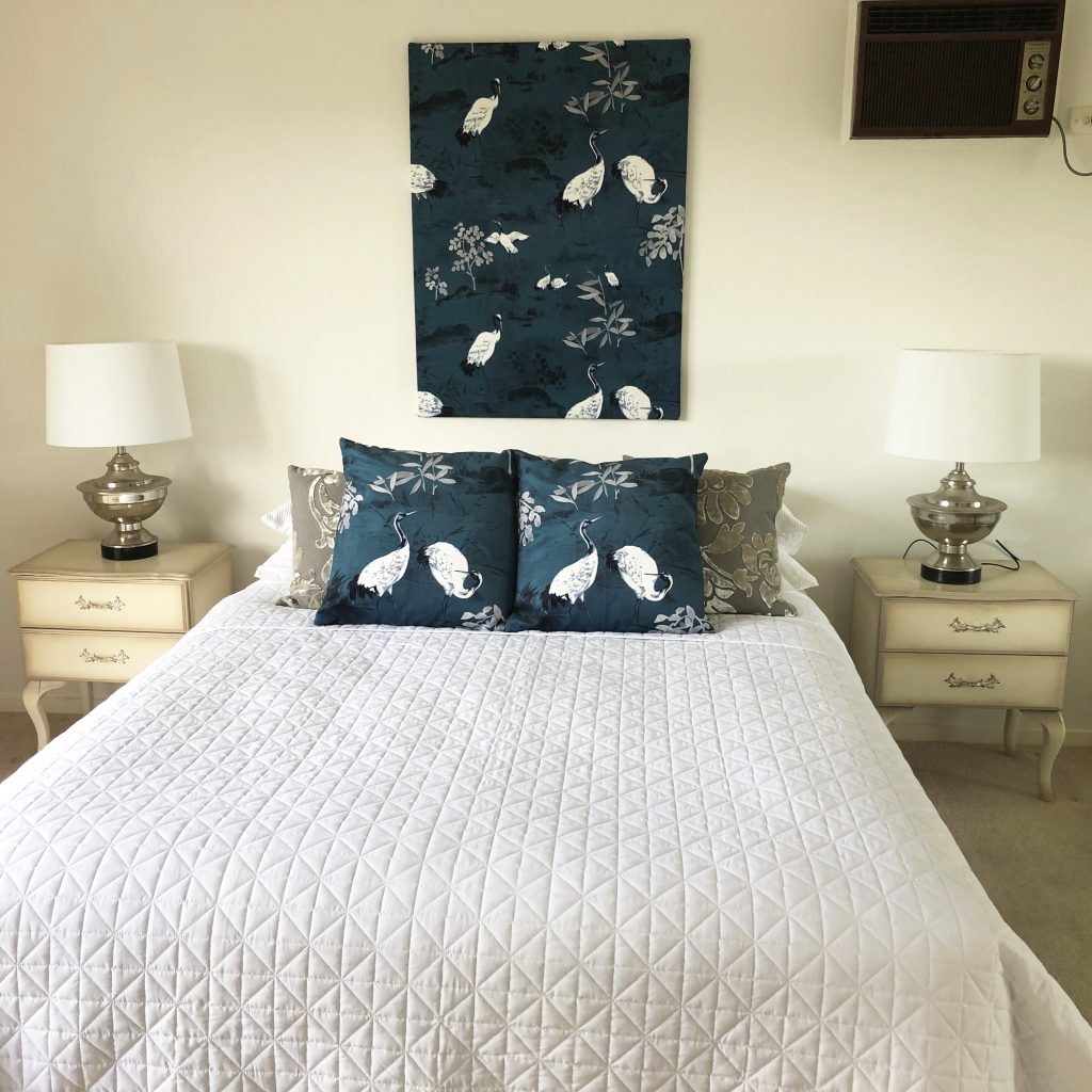 The bedroom had the lamps, bedhead, and artwork removed and contemporary but still traditionally styled furnishings were added in their place.